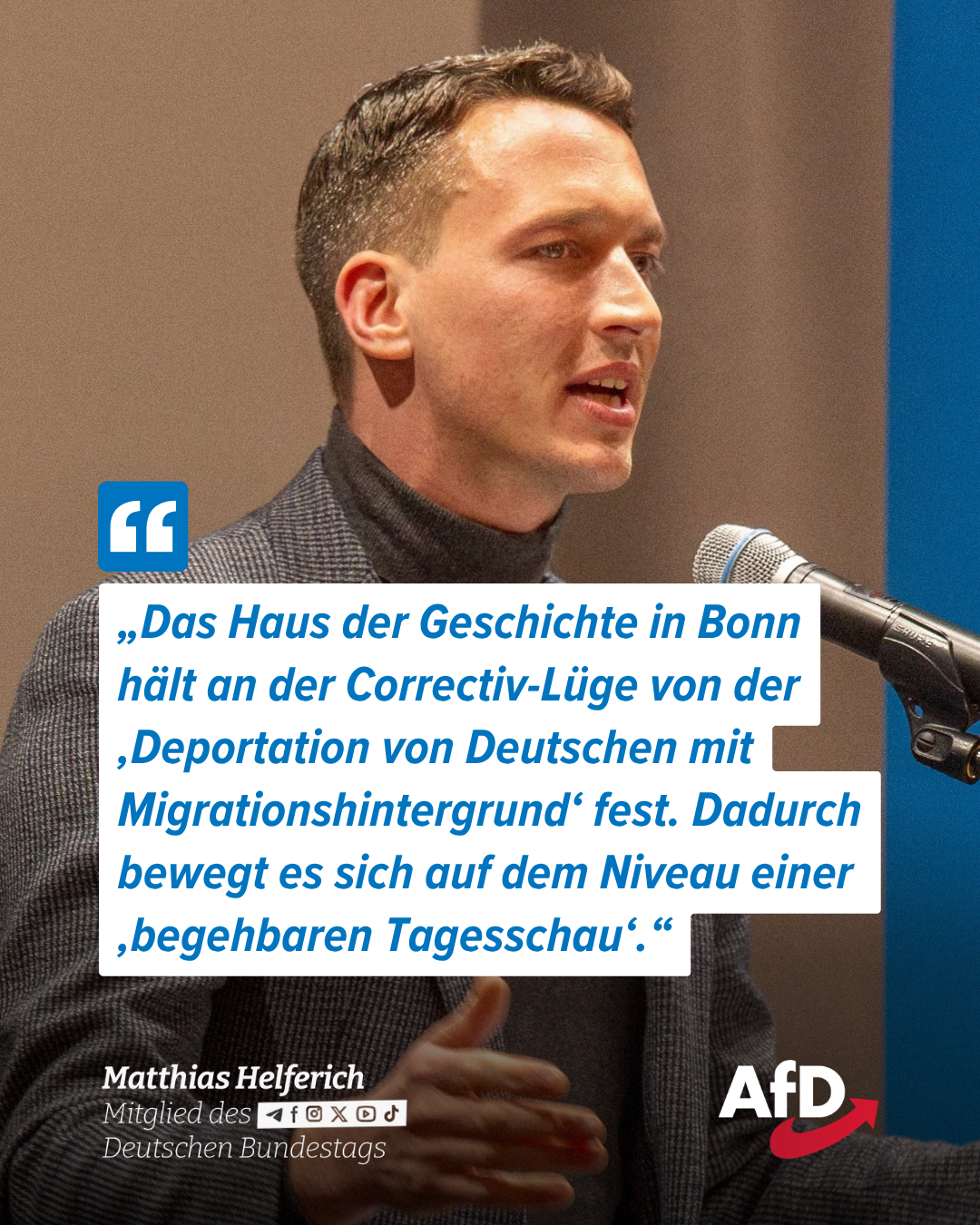 „Das Haus der Geschichte in Bonn hält an der Correctiv-Lüge von der ‚Deportation von Deutschen mit Migrationshintergrund‘ fest. Dadurch bewegt es sich auf dem Niveau einer ‚begehbaren Tagesschau‘.“