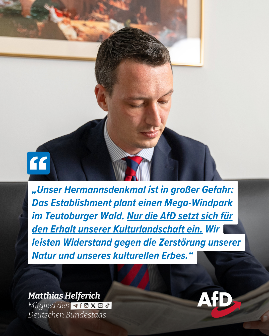 „Unser Hermannsdenkmal ist in großer Gefahr: Das Establishment plant einen Mega-Windpark im Teutoburger Wald. Nur die AfD setzt sich für den Erhalt unserer Kulturlandschaft ein. Wir leisten Widerstand gegen die Zerstörung unserer Natur und unseres kulturellen Erbes.“